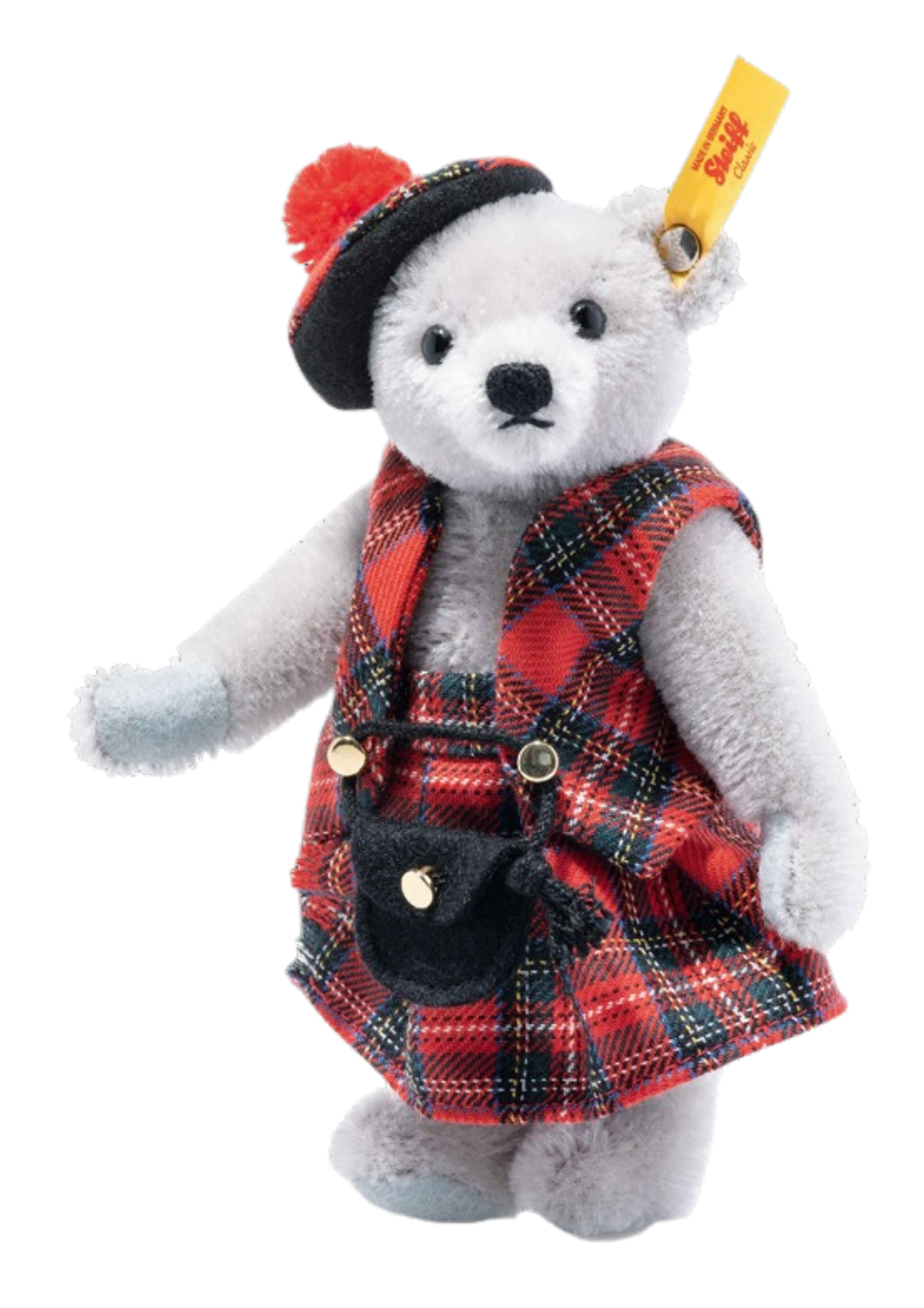 Meet the Steiff Great Escapes Edinburgh Teddy Bear, a charming Scottish ambassador dressed in a traditional kilt with distinctive tartan pattern on his kilt, vest, and cap. This fully jointed companion features light blue mohair fur, expressive black eyes, and a hand-embroidered nose. Ready for cuddles and adventures, this bear brings a wee bit of Edinburgh charm to your home!