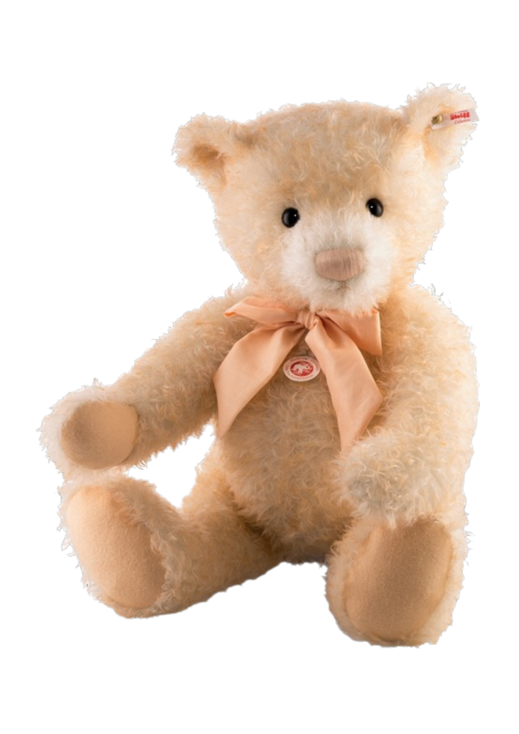 Steiff Little Tina is the perfect cuddly companion with its finest apricot tipped curly mohair and fully jointed body. Its hand-stitched apricot nose and mouth add a touch of sweetness. Adorned with an apricot fabric bow and a signature gold plated button in the ear, this teddy is sure to spark joy and bring comfort to anyone who holds it.