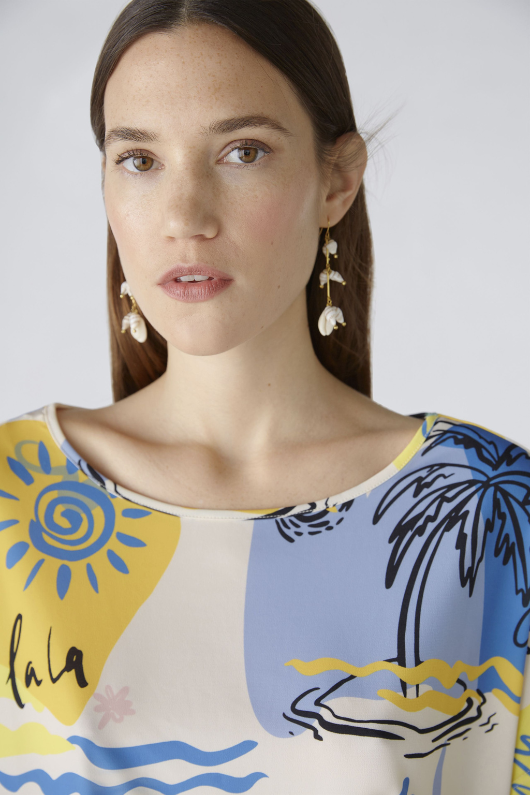 Be effortlessly stylish in the Oui Multi Print Short Sleeve Blouse! With comfortable batwing sleeves and a relaxed fit, this blouse is perfect for any occasion. The drawstring tie waist adds a touch of femininity while the wide neck and all over print add a bold and unique look. Upgrade your wardrobe with this must-have piece!