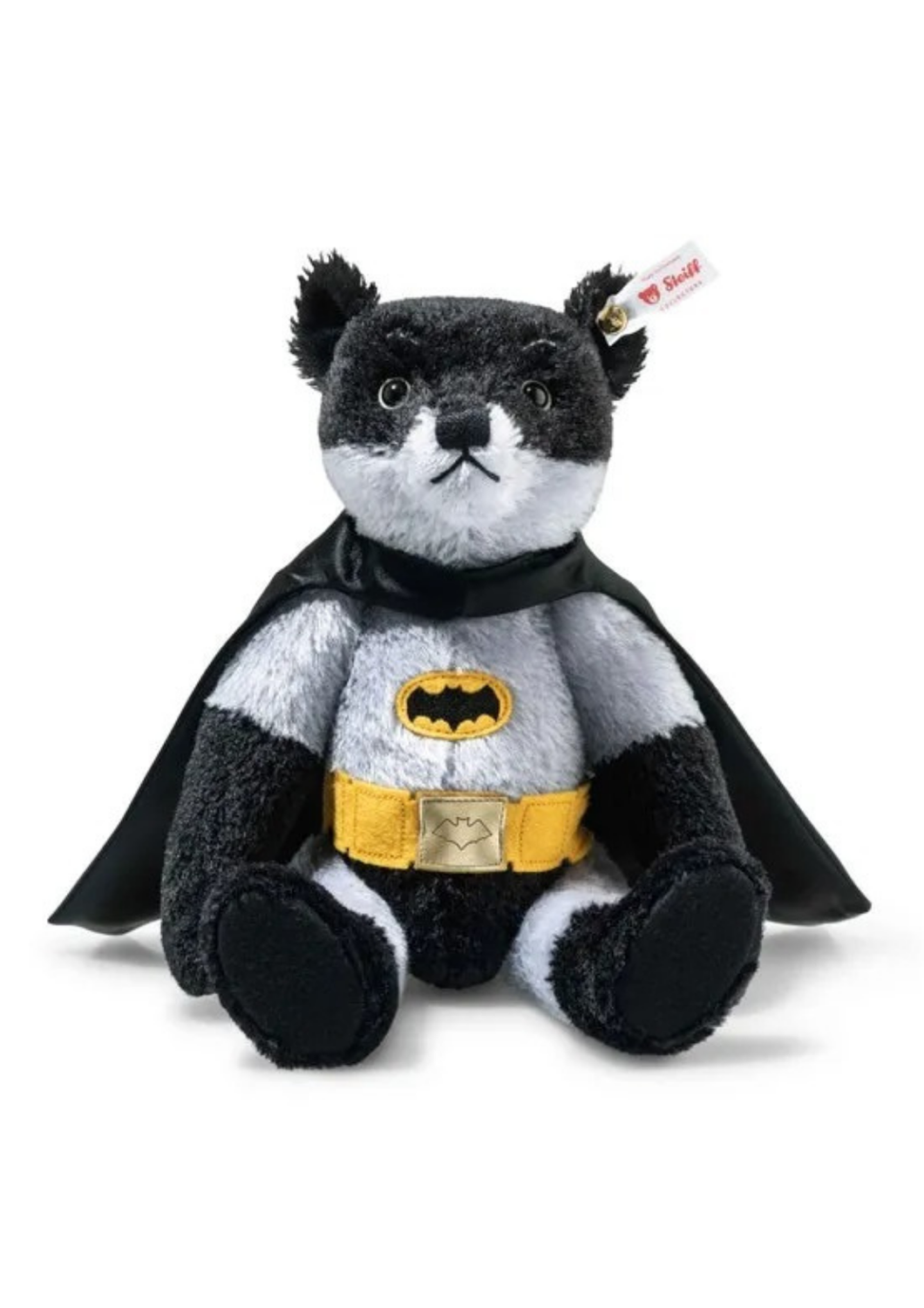 Celebrate the 85th Anniversary of Batman with this crime-fighting Steiff Batman Teddy Bear! Dressed in his iconic costume, this caped crusader is ready to protect your collection from villains lurking in the shadows. By day, a cuddly companion; by night, Gotham's fuzzy defender! The perfect collectible for Batman fans and teddy bear enthusiasts alike.